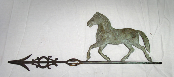g28-top-of-horse-weather-vane-copper1 Published June 11, 2009 at 568 × 252 in g28-top-of-horse-weather-vane-copper1 Good early copper weather vane top of horse. Green oxidation on horse. Arrow portion is iron.